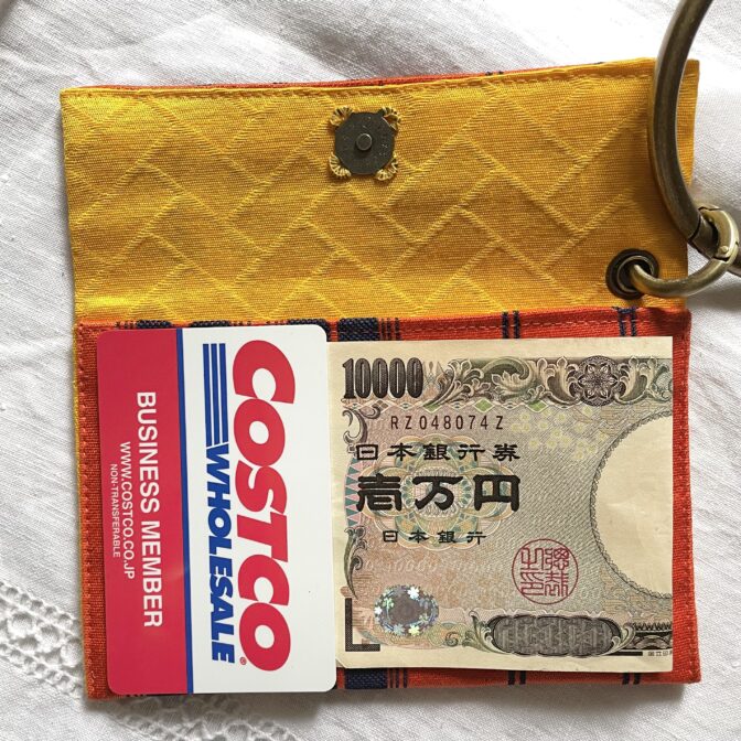 スマホポーチとカード・小物入れ、がま口の3点がセットになっています。