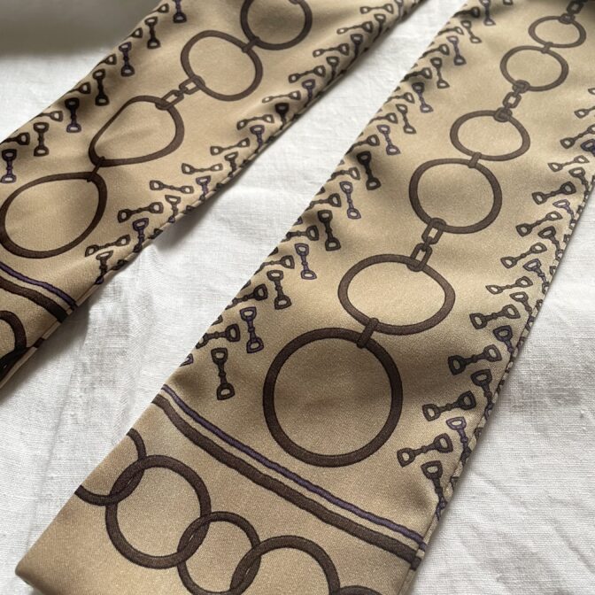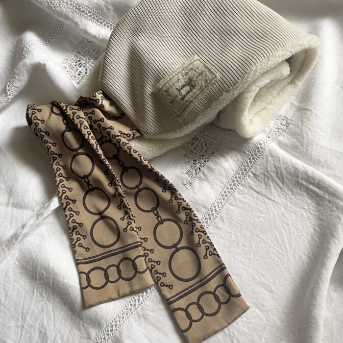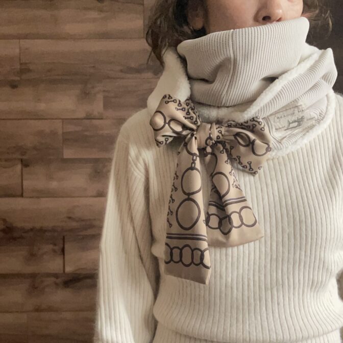 アレンジ次第で色々楽しめる、レトロでシックなスカーフ柄リボンがアクセントのマフラーです。