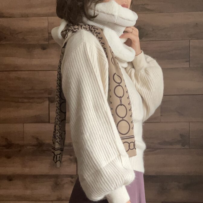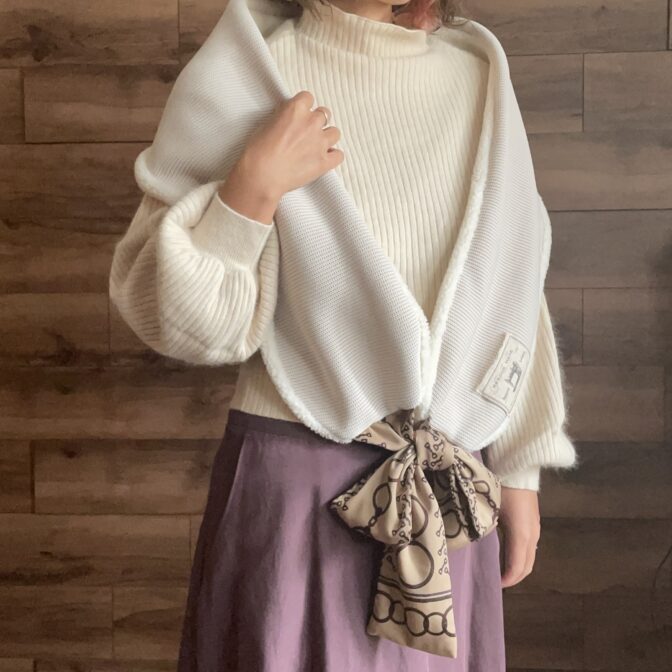 表にニット、裏側にシープボアを使用しているので、巻き方によって表情が変わってくるのも特徴です。